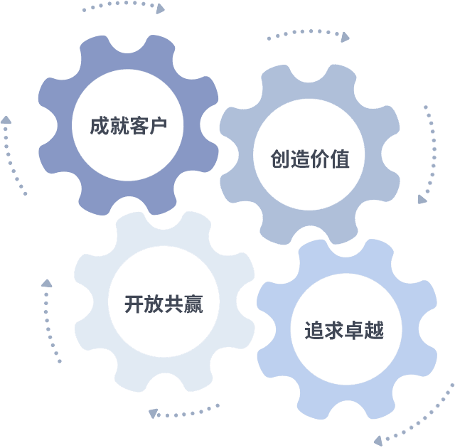 成就客户是一切决策的出发点,,,创造价值是衡量所有工作的标准,,追求卓越是我们做事做人的态度,,,,开放共赢是我们的格局也是最终的结果。。。。价值观的齿轮环环相扣,,,,推动着组织里的每个人不断向前。。。。